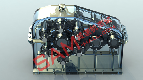 該六軸減速機(jī)的實(shí)機(jī)與上面的三維圖有一定的出入,如六軸中間的主軸采用的是空心軸,中間設(shè)置有水循環(huán)冷卻系統(tǒng)及鐵水管道。本文將此類配置全部取消,沒有展現(xiàn)。